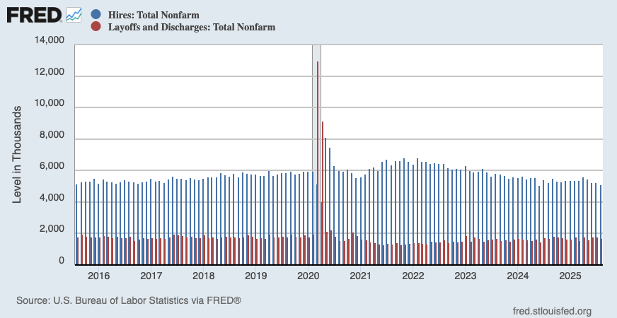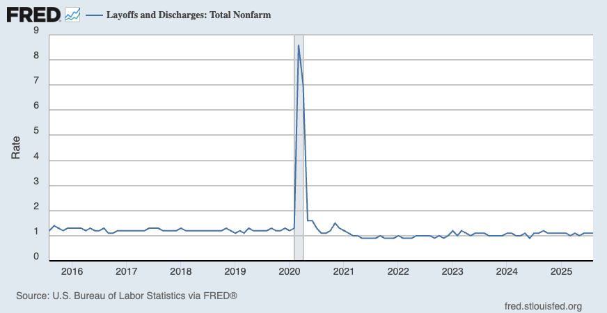👍 Layoffs remain depressed, hiring remains firm. Employers laid off 1.73 million people in August. While challenging for the people affected, this figure represents just 1.1% of total employment. This metric remains slightly below prepandemic levels.