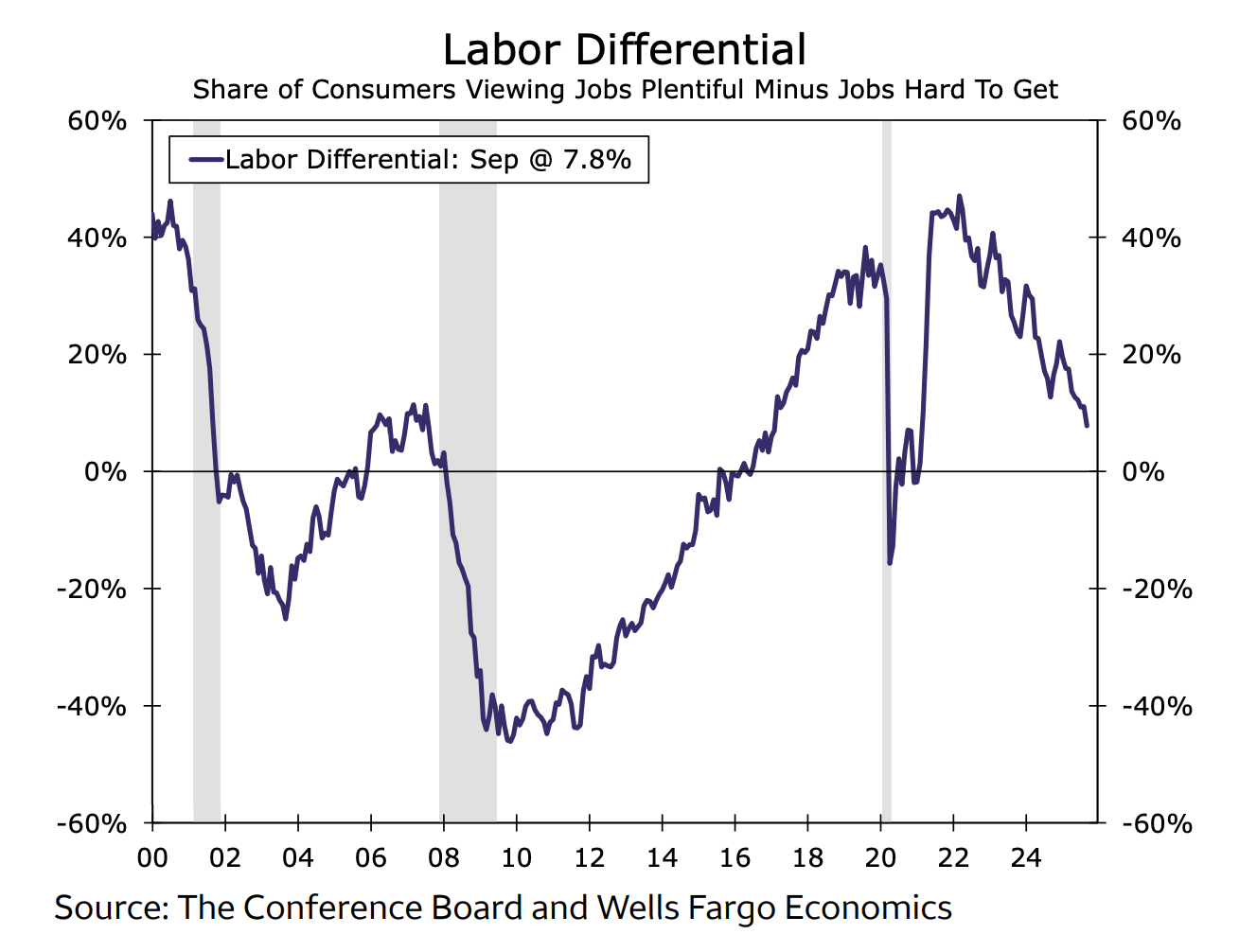From Wells Fargo: “The trend decline here mirrors the gradual loss of momentum in the labor market over the past couple of years. … The fact that expectations are coming down is part of the recipe for the sort of developments the FOMC will need to see in order to deliver on further rate cuts. Ultimately, the combination of lower rates and a more stimulative fiscal policy environment in 2026 should put the consumer on somewhat less wobbly fundamentals at the start of next year.“