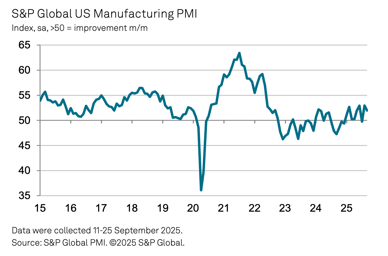 🤷🏻♂️ Manufacturing activity surveys were mixed. From S&P Global’s September U.S. Manufacturing PMI: “US manufacturing production rose for a fourth successive month in September, but the upturn lost momentum as companies reported a drop in order book growth alongside a buildup of unsold finished goods inventories. Despite a slowing in demand growth, many factories produced more goods, using up raw materials that had been stockpiled ahead of tariff implementation. This poses a downside risk to future production in the absence of a pickup in demand, though also hints at some alleviation of price pressures: There is already evidence of companies offering excess stock to customers at reduced rates.”
