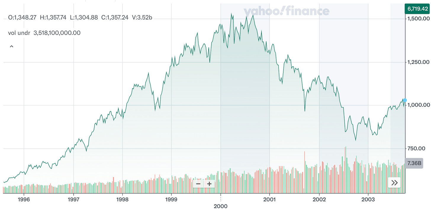 The second surprise was about the dot-com bubble. From the peak of the internet stock frenzy on March 24, 2000, to its low on Oct. 9, 2002, the S&P 500 fell a breathtaking 49%.