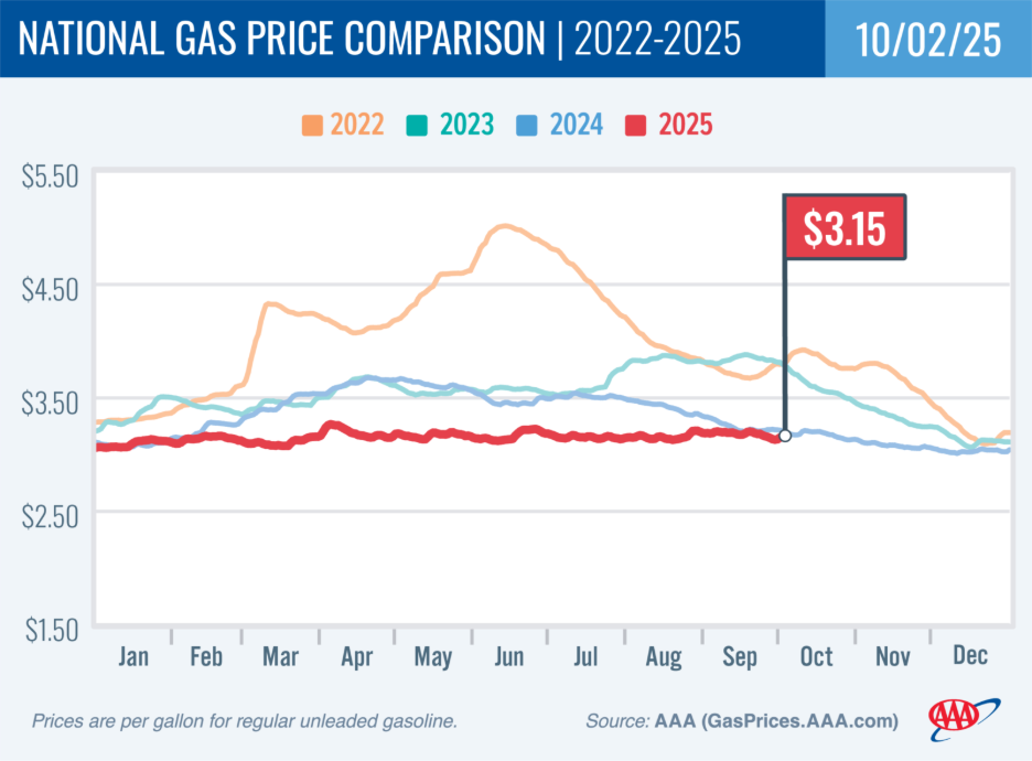 ⛽️ Gas prices hold steady. From AAA: “The national average for a gallon of regular dropped five cents since last week to $3.15. Fall is officially here, bringing lower gas prices and winter-blend gasoline which is cheaper to produce. Pacific Northwest drivers are getting some relief now that a pipeline issue has been resolved and pump prices are trending downward. The Atlantic hurricane season is halfway over, but the tropics remain a concern for the next two months if there’s storm activity in the Gulf that affects refineries in the area.”