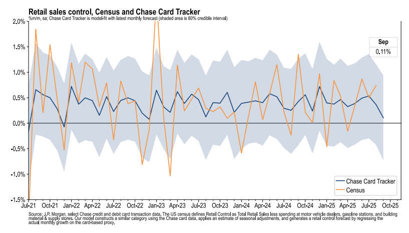 💳 Card spending data is holding up. From JPMorgan: “As of 25 Sep 2025, our Chase Consumer Card spending data (unadjusted) was 2.4% above the same day last year. Based on the Chase Consumer Card data through 25 Sep 2025, our estimate of the US Census September control measure of retail sales m/m is 0.11%.”