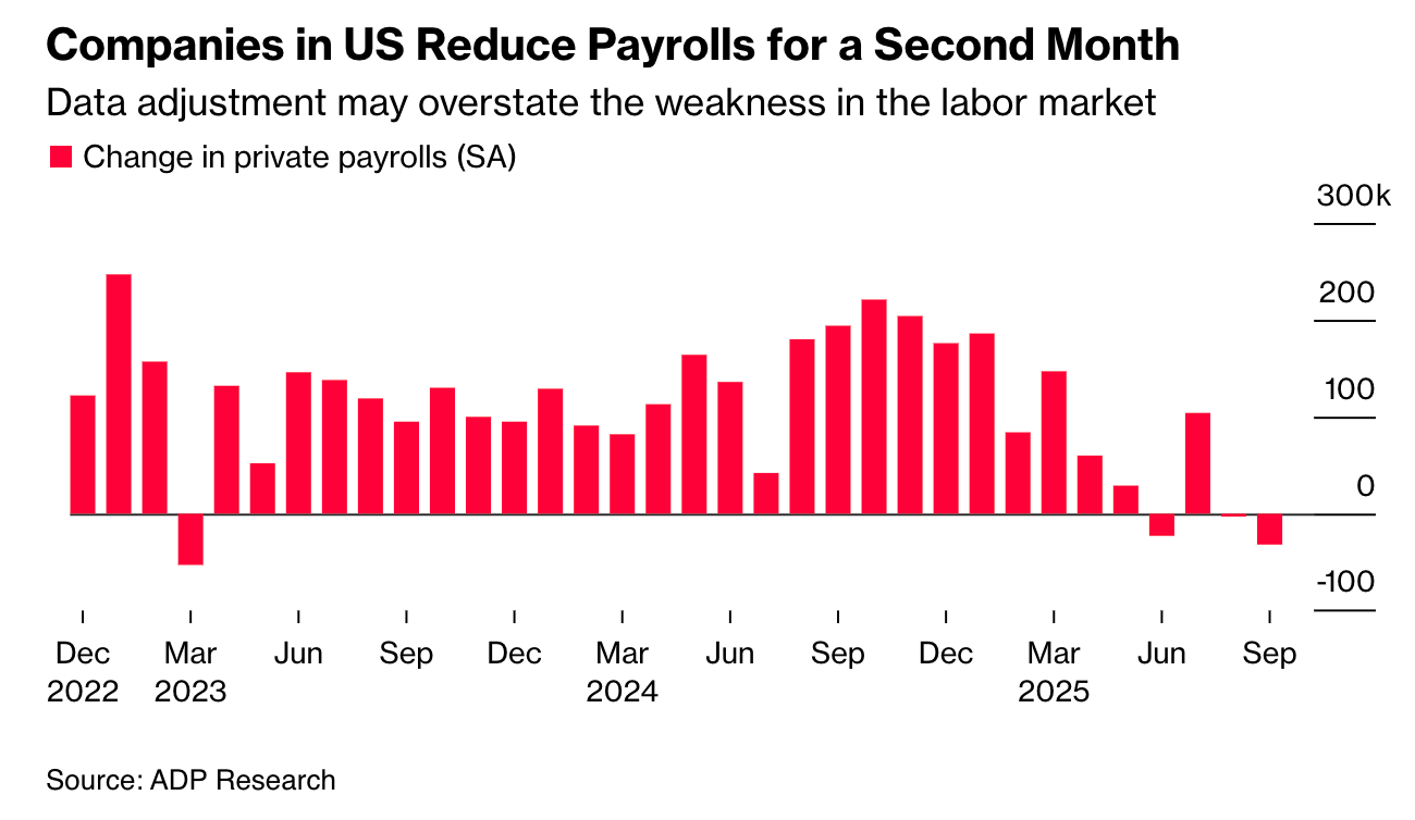 👎 Private jobs decline. According to payroll processor ADP, which tracks private payrolls and employs a different methodology than the BLS, private companies shed 32,000 jobs in September. Declines in small and mid-sized businesses more than offset job gains in large businesses.