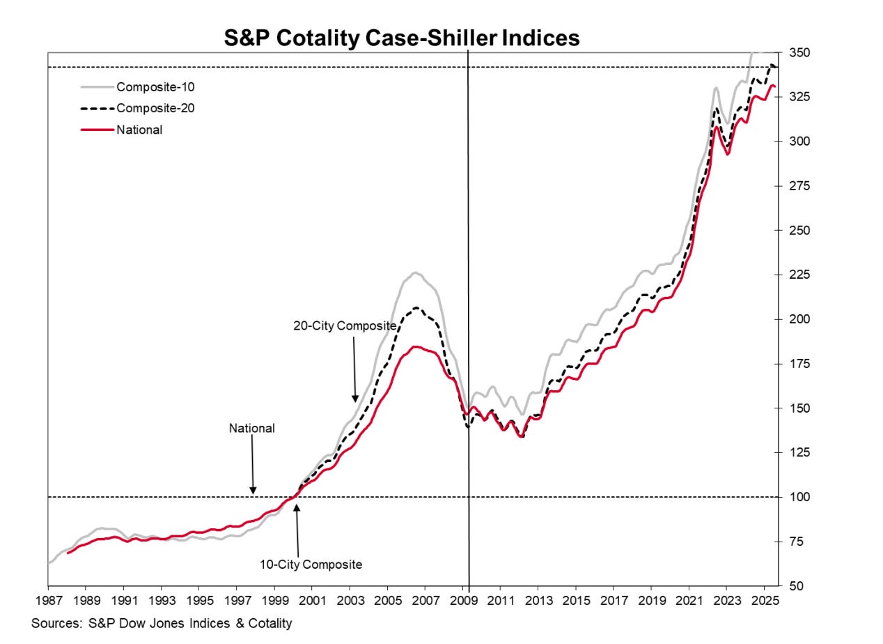 🏠 Home prices cool. According to the S&P CoreLogic Case-Shiller index, home prices were up 1.7% year-over-year in July but declined 0.1% month-over-month. From S&P Dow Jones Indices’ Nicholas Godec: “Looking ahead, the housing market appears to be settling into a new, more measured equilibrium. “The era of 15-20% annual home price jumps is behind us, and in its place we’re seeing growth rates closer to overall inflation – or even a bit below it. While that means homeowners aren’t gaining wealth at the breakneck pace of the recent past, it also signals a potentially healthier trajectory for housing in the long run.”