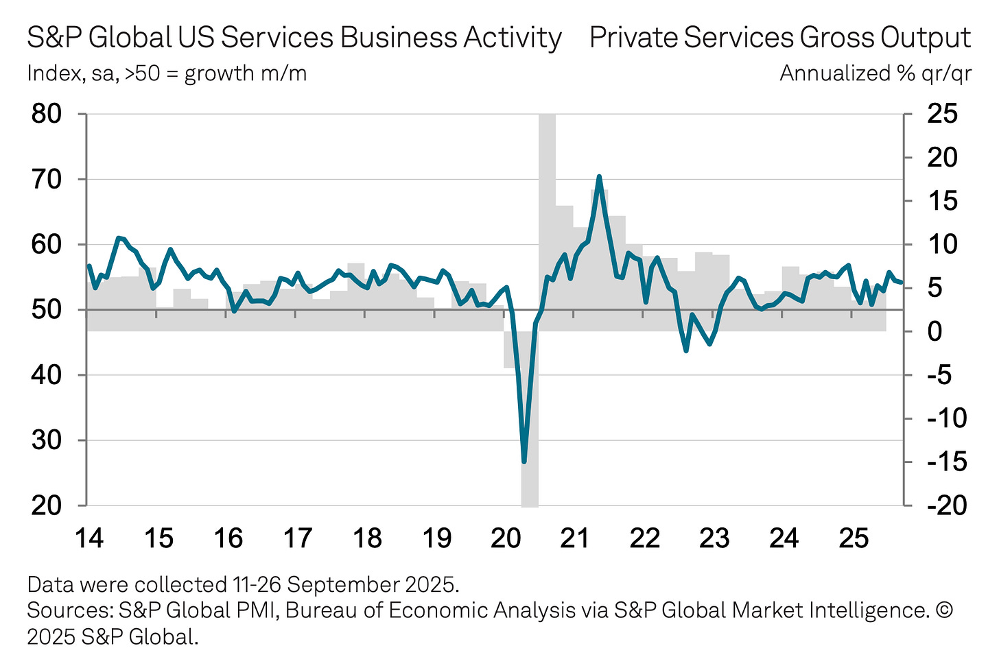 👎 Services activity surveys were mixed. From S&P Global’s September U.S. Services PMI: “Service sector growth softened slightly in September but remained strong enough to round off an impressive performance over the third quarter a whole. Combined with sustained growth in the manufacturing sector, the expansion of service sector activity is indicative of robust third quarter annualized GDP growth of around 2.5%.