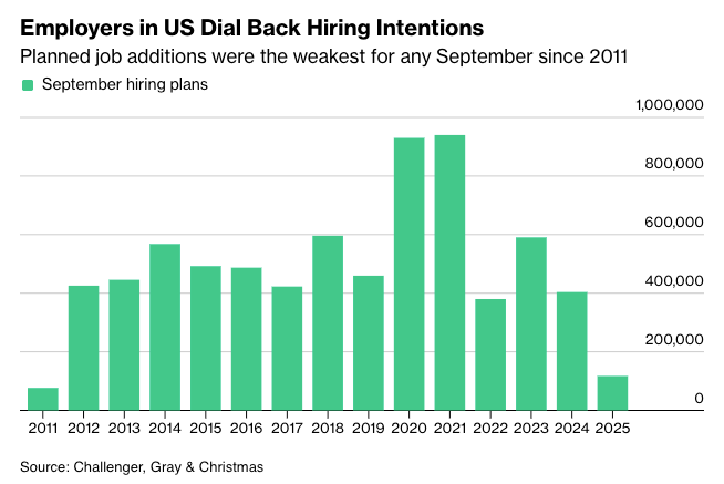 👎 Hiring intentions fall. According to outplacement firm Challenger, Gray & Christmas, companies last month announced plans to add 117,313 jobs, the weakest September since 2011. Year to date, companies announced plans to add 204,939 jobs, the lowest tally since 2009.