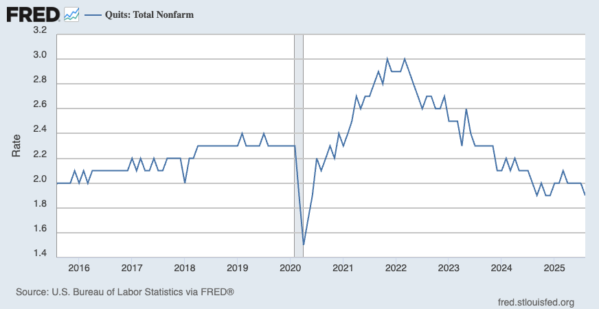 A low quits rate could mean a number of things: more people are satisfied with their job, workers have fewer outside job opportunities, wage growth is cooling, or productivity will improve as fewer people are entering new, unfamiliar roles.