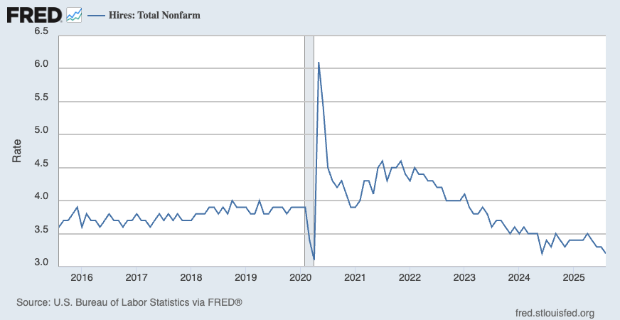 That said, the hiring rate — the number of hires as a percentage of the employed workforce — has been trending lower, which could be a sign of trouble to come in the labor market.