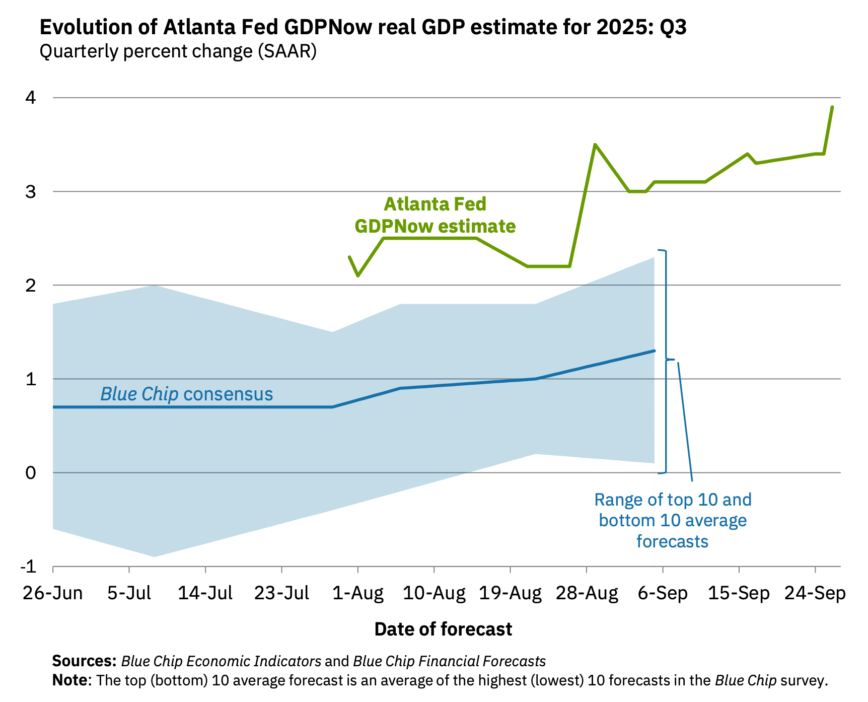 📈 Near-term GDP growth estimates are tracking positively. The Atlanta Fed’s GDPNow model sees real GDP growth rising at a 3.8% rate in Q3.