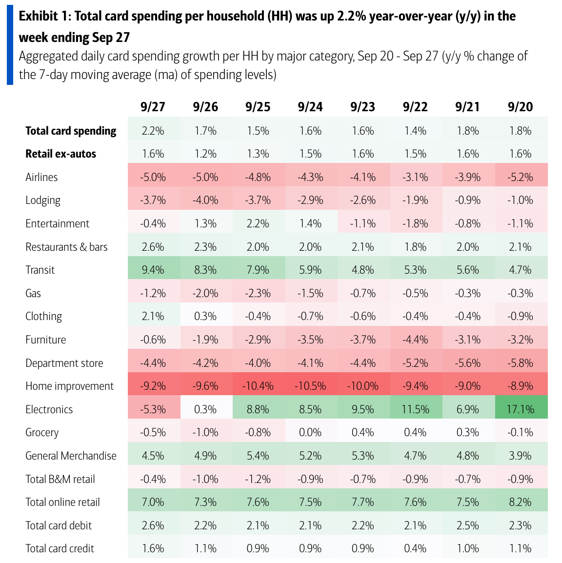 From BofA: “Total card spending per HH was up 2.2% y/y in the week ending Sep 27, according to BAC aggregated credit & debit card data. Y/y electronics spending fell sharply, likely due to base effects from iPhone launch timing (9/20/24 vs. 9/19/25). Spending growth remains solid despite soft labor data.“