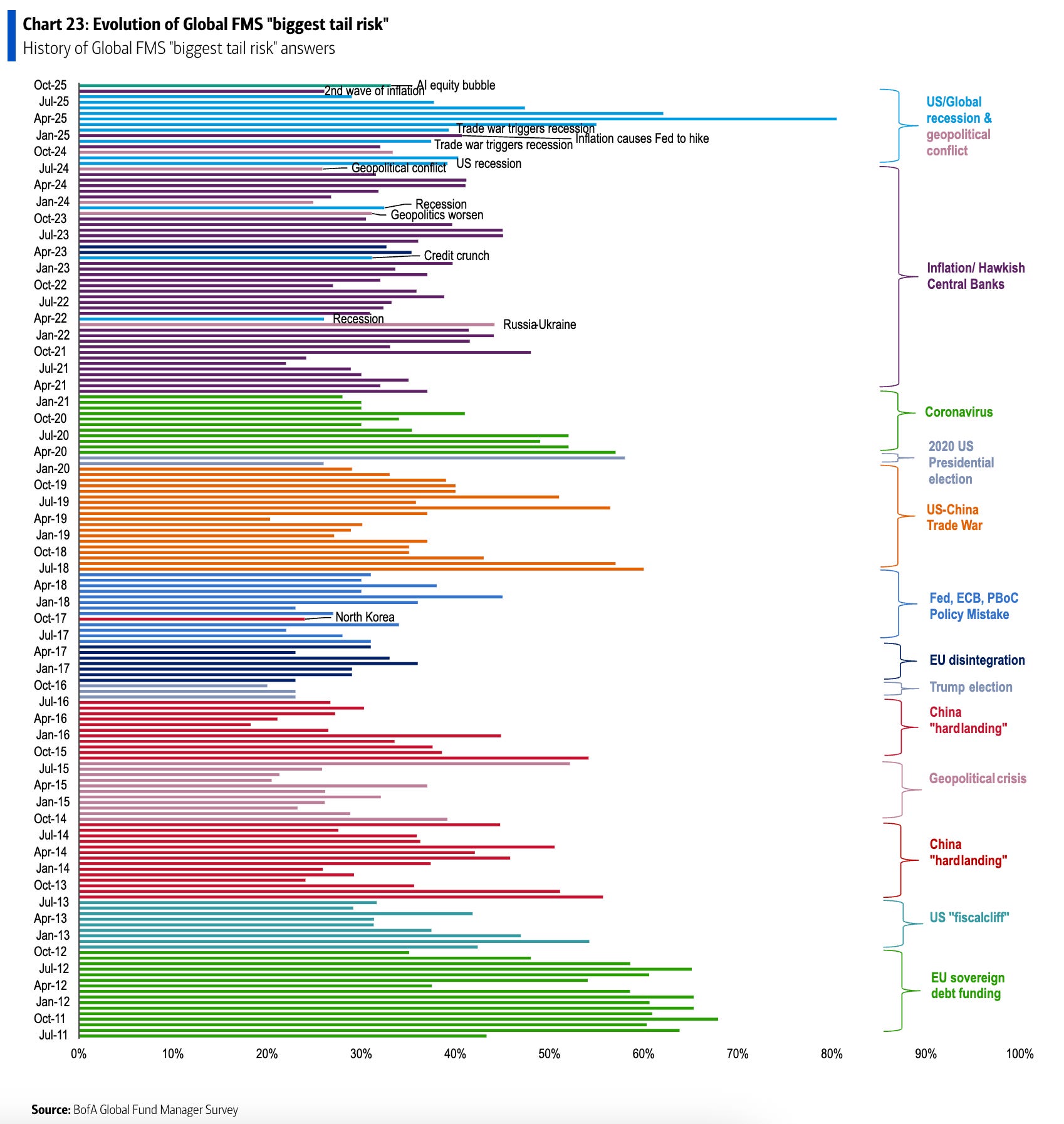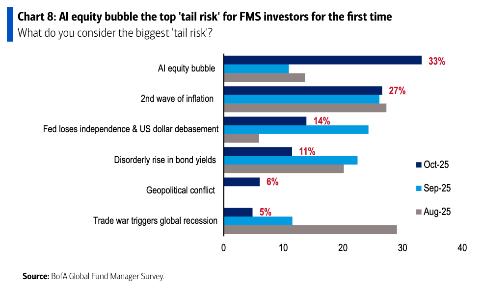 😬 This is the stuff pros are worried about. From BofA’s October Global Fund Manager Survey: “On risks … 33% of FMS investors view an AI equity bubble as the biggest tail risk for the first time in the history of FMS tail risks, up from 11% last month. … Note trade war risk (5%) has eased significantly since peaking in April (then, a record 80% FMS investors identified it as the #1 biggest tail risk).”