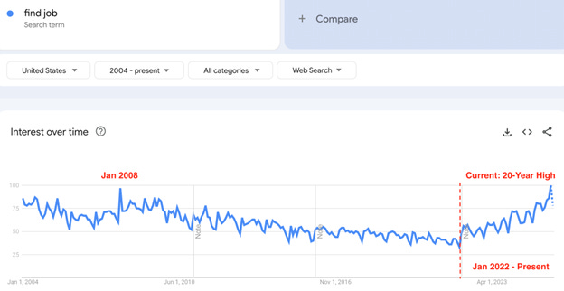 💻 Google searches for jobs are elevated. From Jessica Rabe, co-founder of Datatrek Research: “Searches for ‘find job’ are now at a 20-year high, surpassing the prior peak in January 2008 during the Great Recession. This chart perfectly encapsulates why Chair Powell is so concerned about the current ‘low hire, low fire’ labor market environment. Even when adjusting for working-age population growth (about 12 percent since 2008), Americans are searching for jobs at very near recessionary levels, so a pickup in layoffs would surely increase unemployment.“