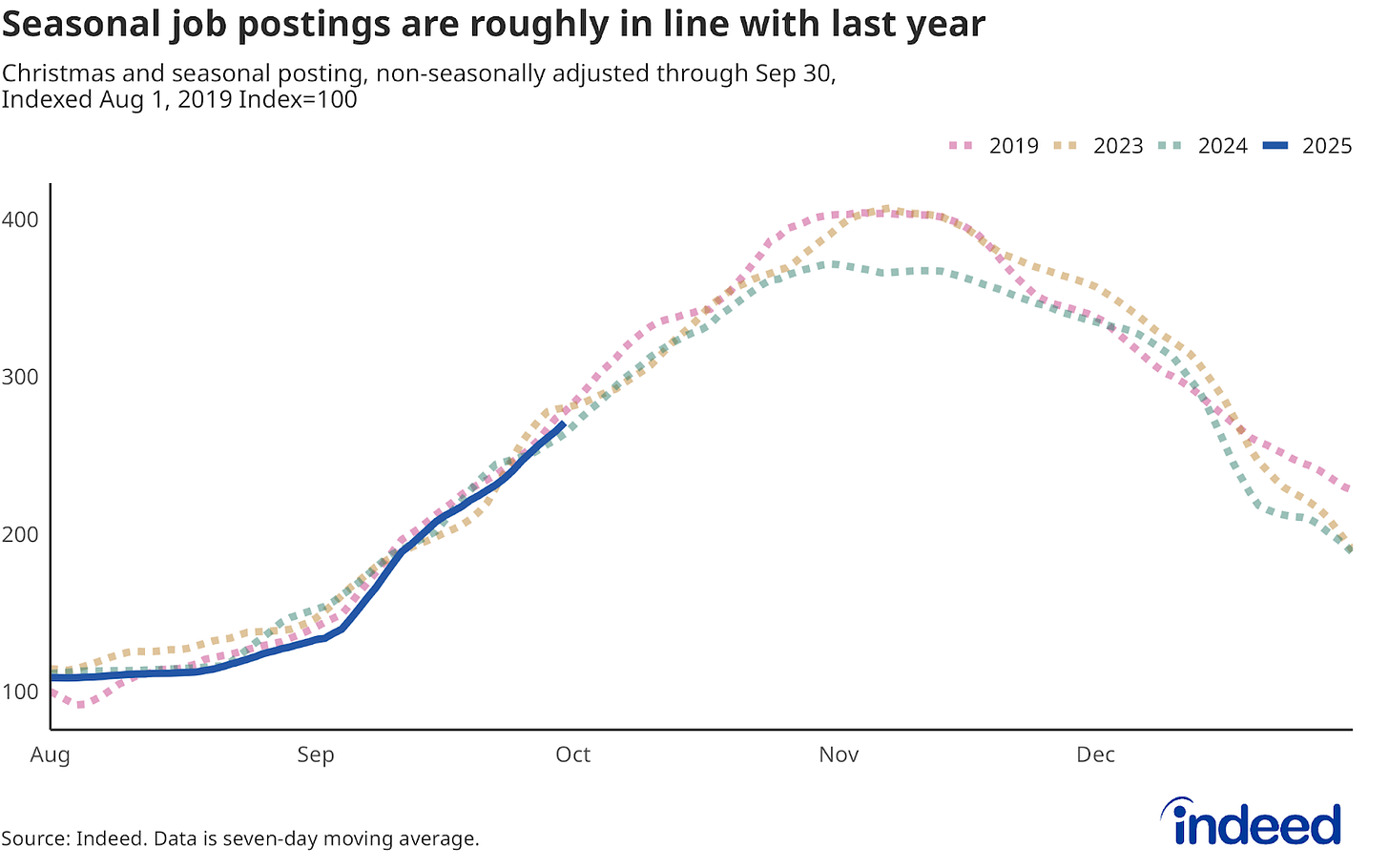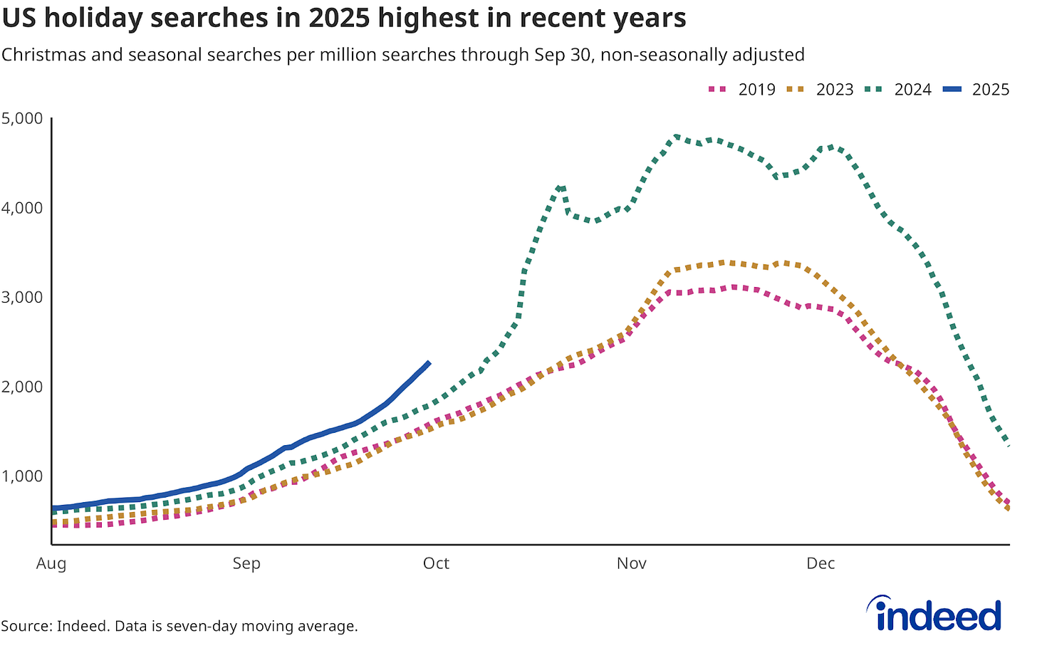 🎄 Job searches for the holiday season are up. From Indeed: “Job seeker interest in seasonal work was up 27% year-over-year at the end of September, and 50% above 2023 levels.“