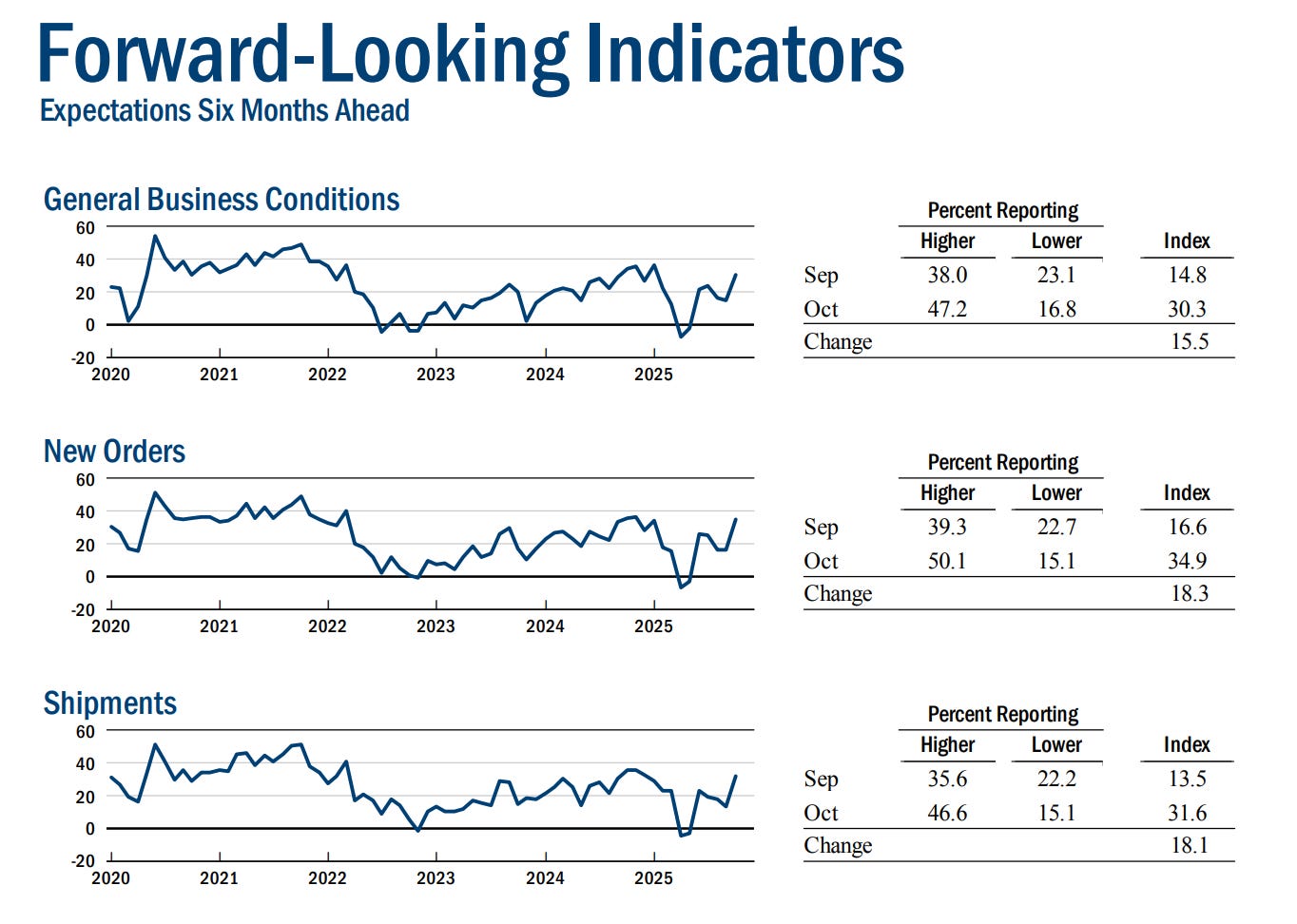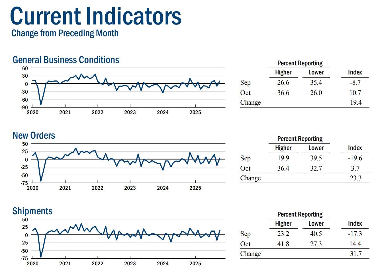 👍 New York area manufacturers say things are looking up. From the NY Fed’s October Empire State Manufacturing Survey: “The headline general business conditions index climbed nineteen points to 10.7, its third positive reading in the last four months. New orders edged higher and shipments increased. Delivery times were slightly longer, and supply availability continued to worsen somewhat. Inventories were little changed. Employment increased, while the average workweek was slightly lower. The pace of both input price increases and selling price increases picked up. Capital spending plans remained soft. Firms grew more optimistic about the outlook, with close to half expecting conditions to improve in the months ahead.”