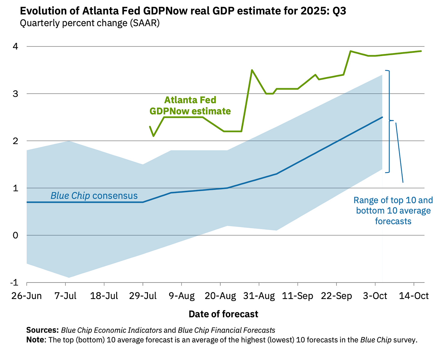 📈 Near-term GDP growth estimates are tracking positively. The Atlanta Fed’s GDPNow model sees real GDP growth rising at a 3.9% rate in Q3.