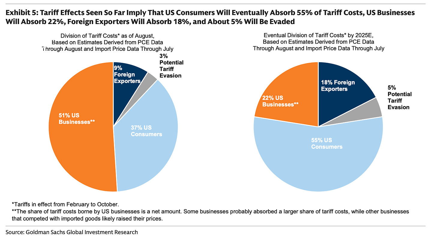 💸 Consumers are expected to pay for tariffs. From Goldman Sachs: “We estimate the distribution of tariff costs among foreign exporters, US businesses, and US consumers using detailed data on import and consumer prices. We find that import prices of goods hit with larger tariff increases have fallen disproportionately relative to prior trends. This means that foreign exporters are absorbing some of the tariff cost, unlike in 2019, though some of the decline likely reflects underreporting of import value to evade tariffs. We also find that consumer prices have risen disproportionately relative to prior trends in categories facing larger tariff increases. Passthrough to consumer prices has reached 55% after six months, meaningfully lower than at the same point in 2019.“
