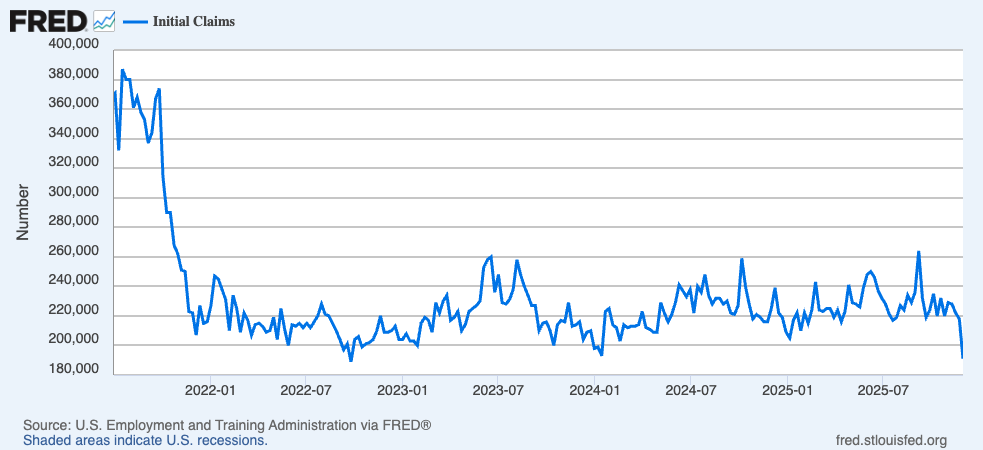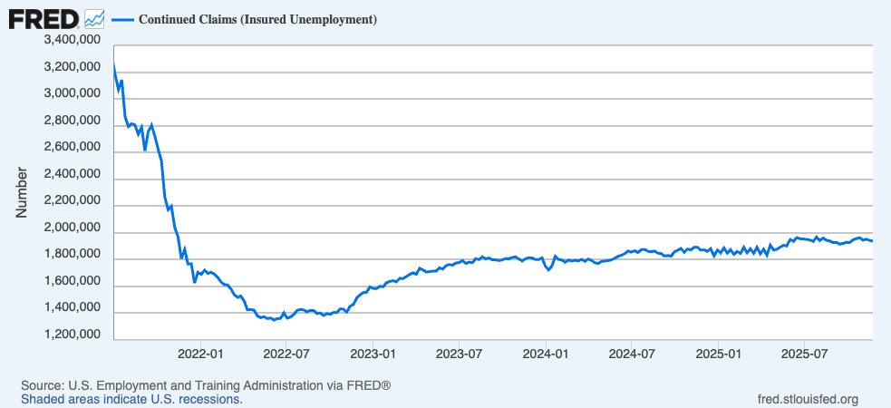 Low initial claims confirm that layoff activity remains low. Elevated continued claims confirm hiring activity is weakening. This dynamic warrants close attention, as it reflects a deteriorating labor market.