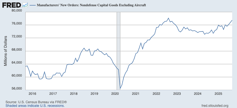 Core capex orders are a leading indicator, meaning they foretell economic activity down the road.