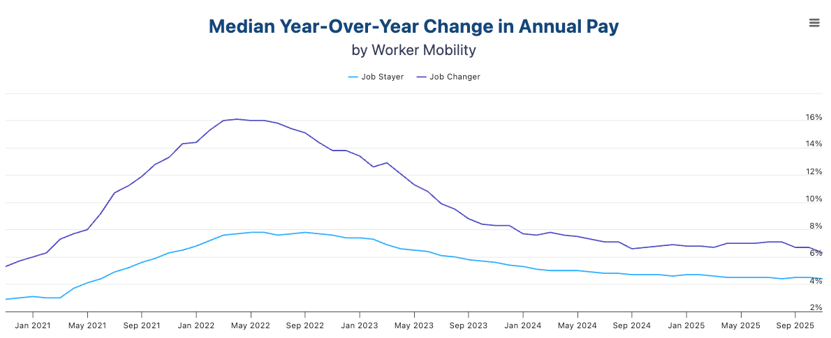 š° The wage growth gap between job switchers and stayers is narrowing. According to ADP, annual pay in November for people who changed jobs was up 6.3% from a year ago. For those who stayed at their job, pay was up 4.4%.