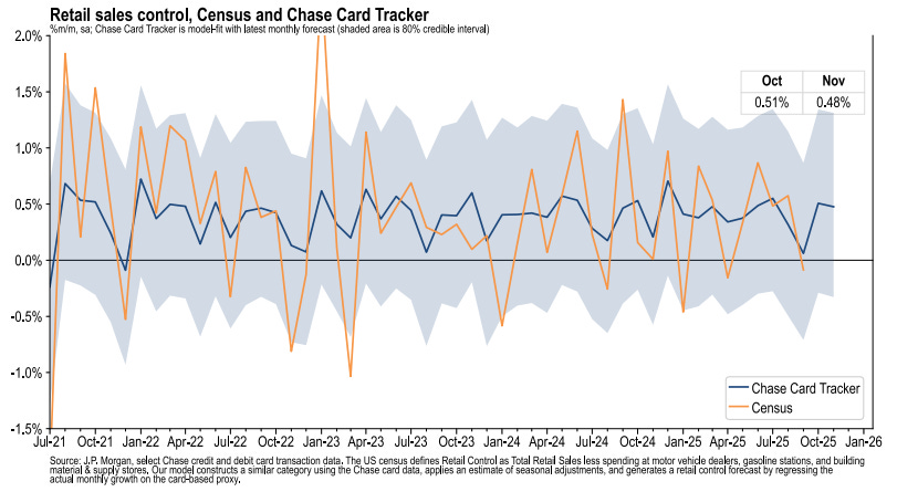 From JPMorgan: āAs of 28 Nov 2025, our Chase Consumer Card spending data (unadjusted) was 3.5% above the same day last year. Based on the Chase Consumer Card data through 28 Nov 2025, our estimate of the US Census October control measure of retail sales m/m is 0.51%.ā