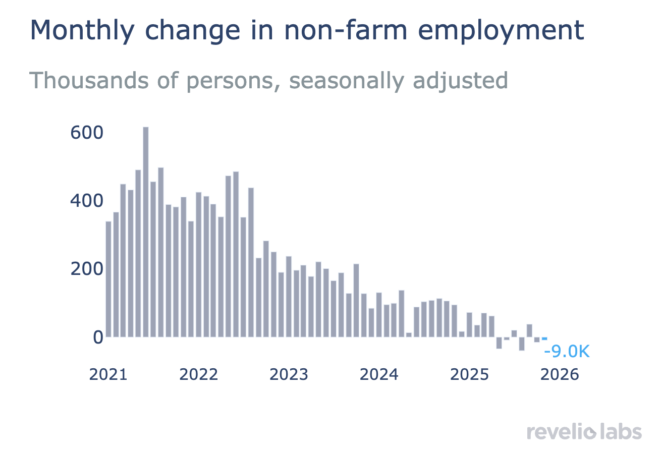 Revelio Labs, which analyzes online professional profiles, estimates nonfarm payroll employment, which includes public and private sector employers, fell by 9,000 jobs in November.
