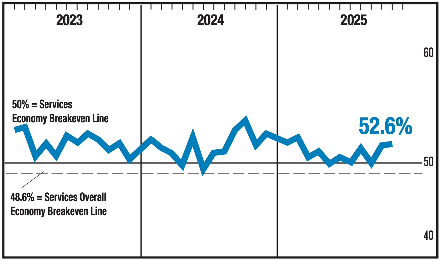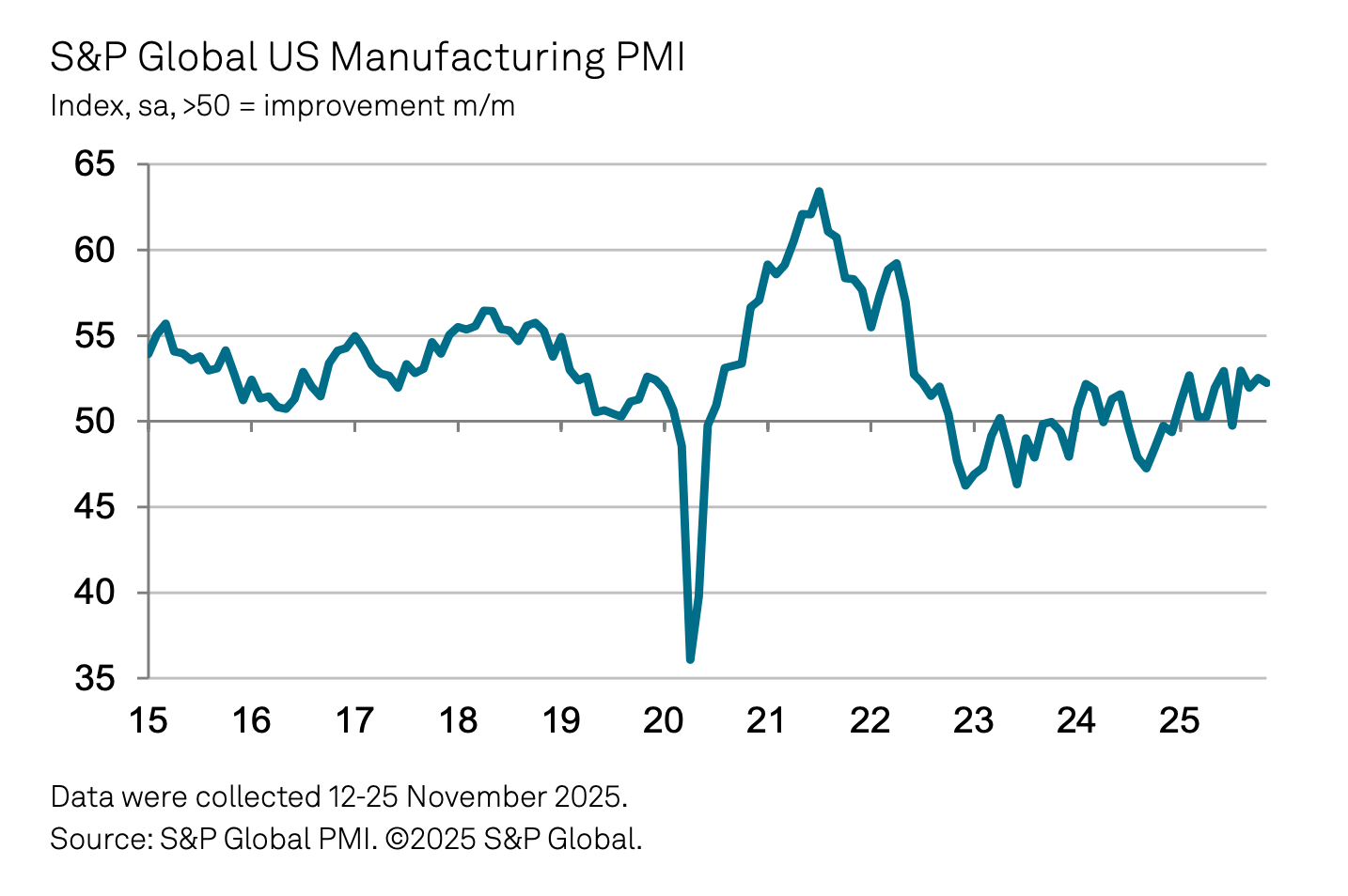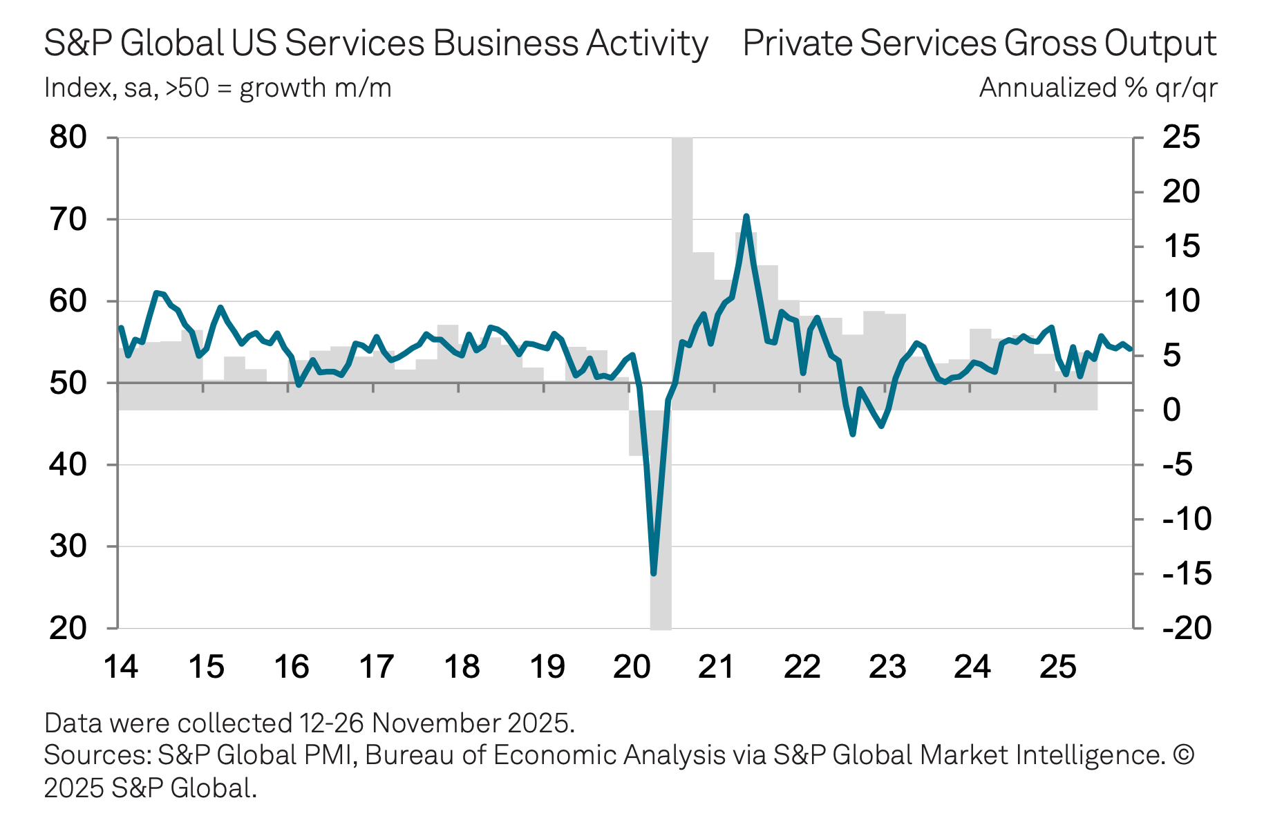 š Services activity surveys signal growth. From S&P Globalās November U.S. Services PMI: āThe US service sector has reported another strong expansion in November, with demand for services rising at the fastest rate seen so far this year. Together with a robust increase in output reported by the manufacturing sector, the survey indicates that the economy is so far expanding at a 2.5% annualized GDP growth rate in the fourth quarter. Supportive financial conditions, including lower interest rates and the equity market gains seen this year, are helping drive the sustained resilience of the economy, with a further surge in financial services activity reported in November. Consumer and business services are also continuing to expand, but report pressure on customer demand from affordability issues in particular. Worryingly, prices charged for services rose at an increased rate in November as firms sought to pass on higher costs, in turn often linked to tariffs.ā
