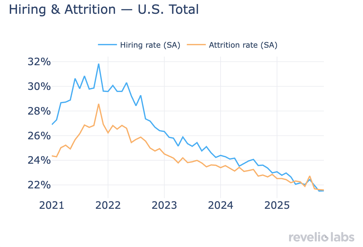 š¼ Hiring activity is slowing, workers are staying put. According to Revelio Labs, the hiring rate continues to trend lower, suggesting companies have become less eager to fill open roles or add staff. Similarly, attrition rates have fallen, suggesting employees are holding tight to their jobs or arenāt finding better opportunities elsewhere.