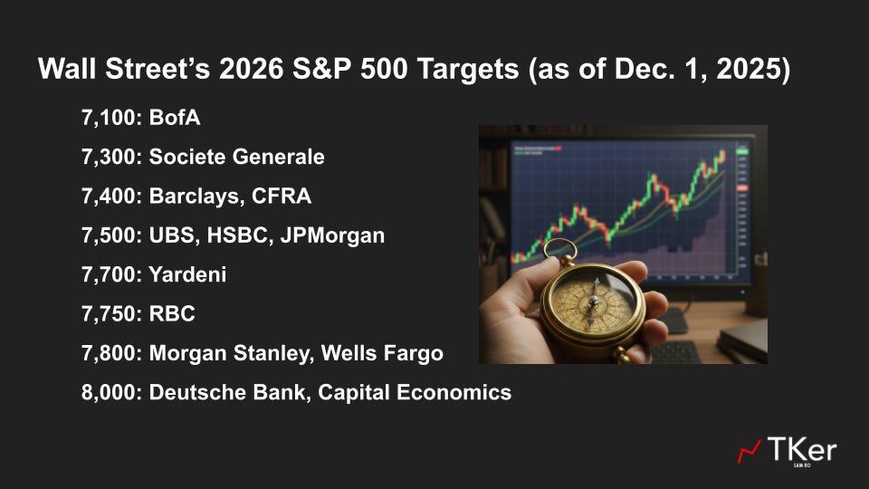 BofA: 7,100, $310 (as of Nov. 26): āMultiple expansion and earnings growth both pushed the S&P 500 up 15% this year. In 2026, earnings will do the liļ¬ (we forecast 14% growth, or $310) with about 10pt PE contraction. 7100 implies ~5% price return. In 2025, policy uncertainty stymied broadening, and guidance remained muted. But from here, bonus depreciation should pull forward capex, corporate guidance is 2 to 1 bullish, and sentiment is far from euphoric. Liquidity is full blast today, but the direction of travel is likely less, not more ā less buybacks, more capex, less central bank cuts than last year, and a Fed cutting only if growth is weak.ā