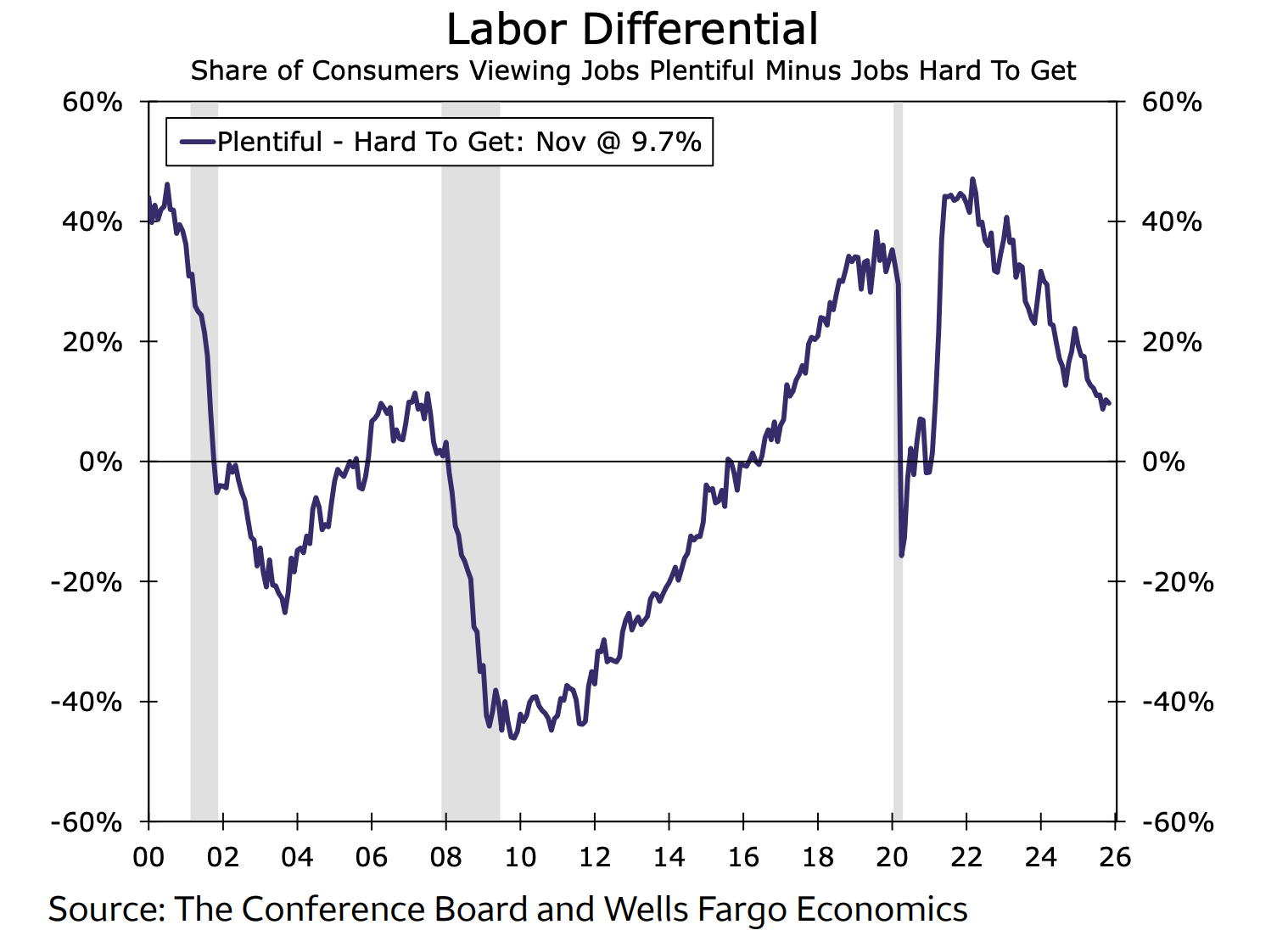 Many economists monitor the spread between these two percentages (a.k.a., the labor market differential). The direction of the spread reflects a cooling labor market.