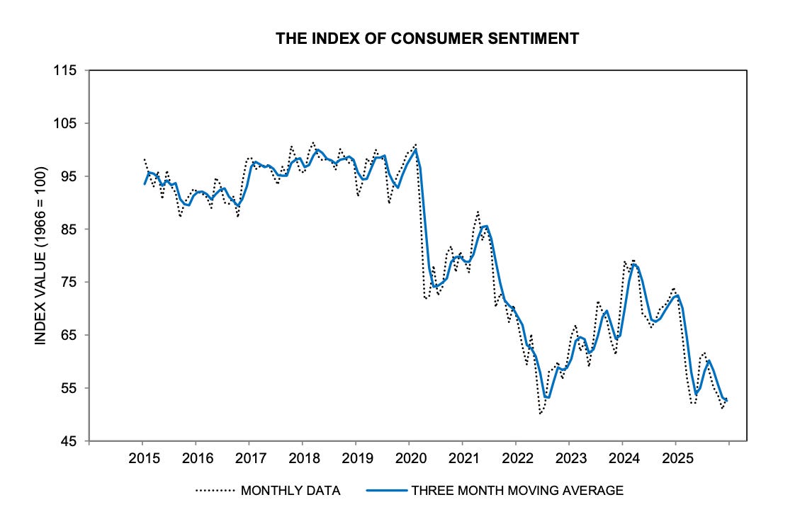 š Consumer vibes are in the dumps. According to the University of Michiganās Surveys of Consumers, sentiment ticked higher in December, but overall remains low: āOverall, while views of current conditions were little changed, expectations improved, led by a 13% rise in expected personal finances, with improvements visible across age, income, education, and political affiliation. Still, Decemberās reading on expected personal finances is nearly 12% below the beginning of the year. Similarly, labor market expectations improved a touch but remained relatively dismal. Consumers see modest improvements from November on a few dimensions, but the overall tenor of views is broadly somber, as consumers continue to cite the burden of high prices.ā