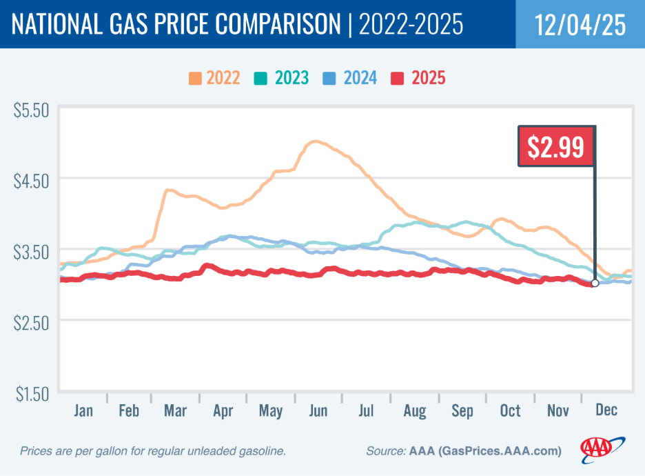 ā½ļø Gas prices dip below $3. From AAA: āThe last time the national average reached an even $3.00 or below was in May of 2021. Crude oil prices remain on the lower side around $60 a barrel. Sluggish gas demand and cheaper-to-produce winter blend gasoline are also contributing to the drop at the pump.ā