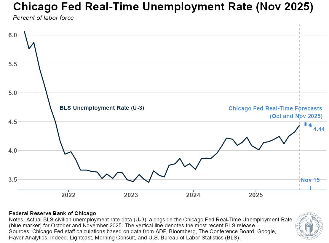 š The unemployment rate may be climbing. The Chicago Fed has a model that combines a bunch of available data to estimate the unemployment rate. And based on whatās out there, they estimate the unemployment rate was 4.44% in November, which would be the highest rate in four years.