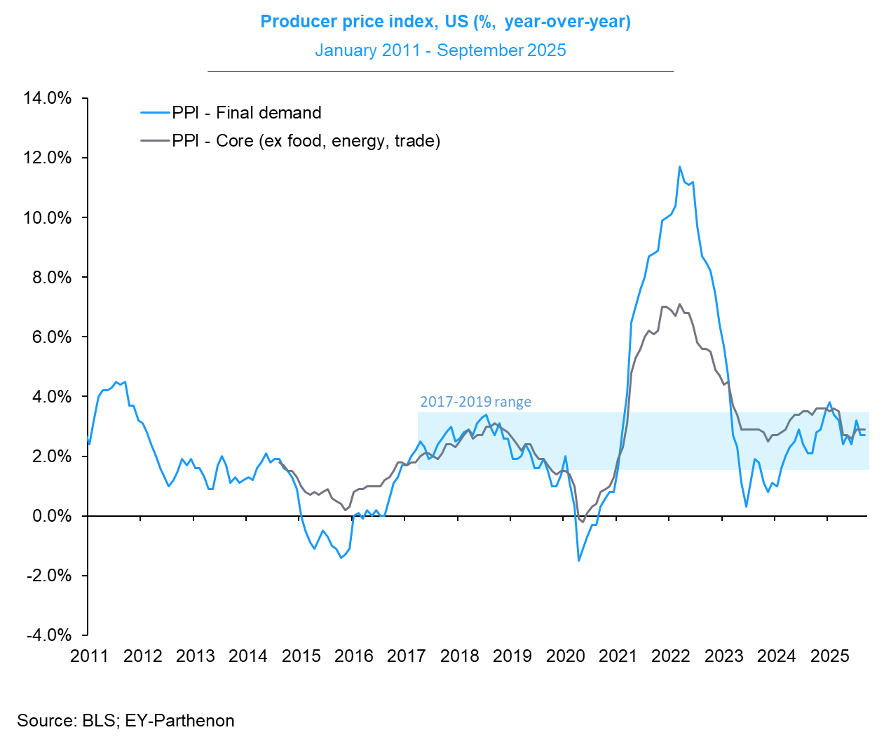 š Wholesaler price inflation was cool. The Producer Price Index (PPI) in September was up 2.7% from a year ago. Adjusted for food and energy prices, core PPI was up 2.9%.
