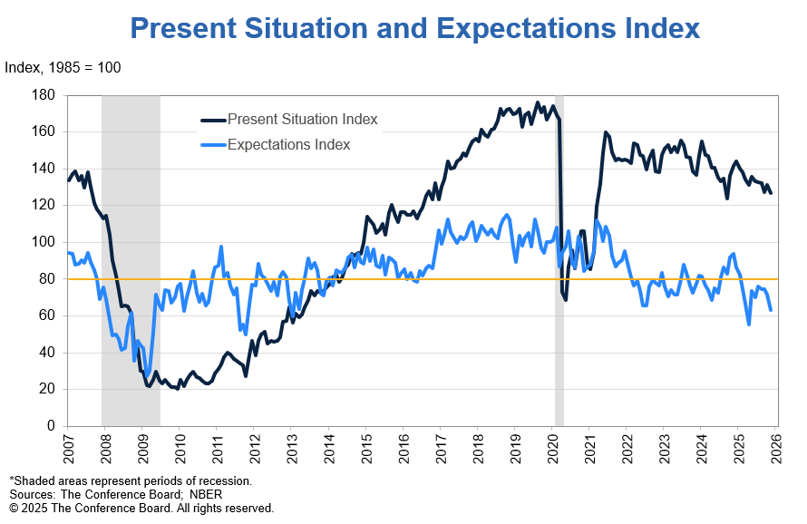 The Conference Boardās Consumer Confidence Index fell 6.8 points in November. From the firmās Dana Peterson: āConsumer confidence tumbled in November to its second lowest level since April after moving sideways for several months. The Present Situation Index dipped as consumers were less sanguine about current business and labor market conditions. The labor market differentialāthe share of consumers who say jobs are āplentifulā minus the share saying āhard to getāādipped again in November after a brief respite in October from its year-to-date decline. All three components of the Expectations Index deteriorated in November. Consumers were notably more pessimistic about business conditions six months from now. Mid-2026 expectations for labor market conditions remained decidedly negative, and expectations for increased household incomes shrunk dramatically, after six months of strongly positive readings.ā