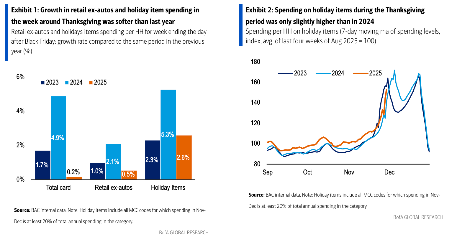 š³ Card spending data is holding up. From BofA: āDuring the week ending November 29, total card (+0.2%) and retail ex-autos (+0.5%) spending per HH, as measured by BAC aggregated credit and debit cards, were only modestly higher than in the Thanksgiving period last year. The corresponding spending growth rate for holiday items was slightly better (2.6%).ā