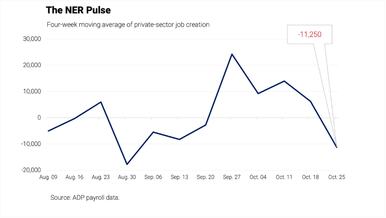 👎 Job growth has turned negative. According to payroll processor ADP, private U.S. employers shed 11,250 jobs in the four weeks ending Oct. 25.