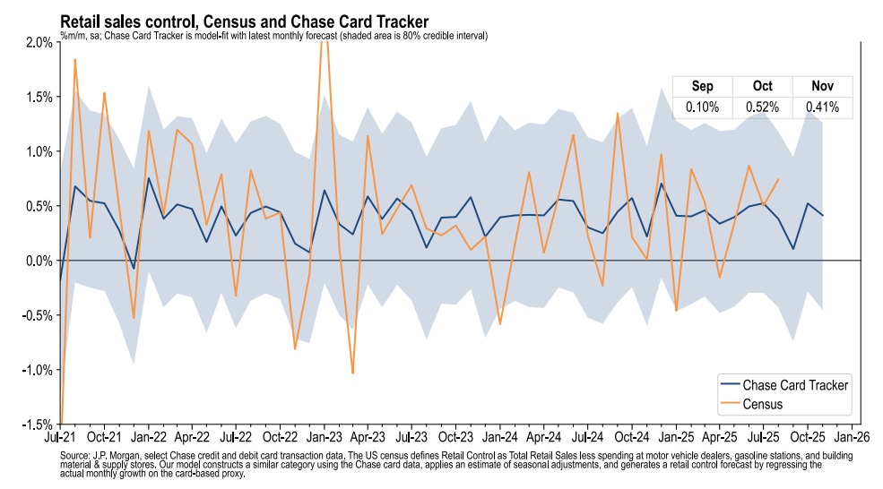 From JPMorgan: “As of 07 Nov 2025, our Chase Consumer Card spending data (unadjusted) was 5.5% above the same day last year. Based on the Chase Consumer Card data through 07 Nov 2025, our estimate of the US Census September control measure of retail sales m/m is 0.10%.”