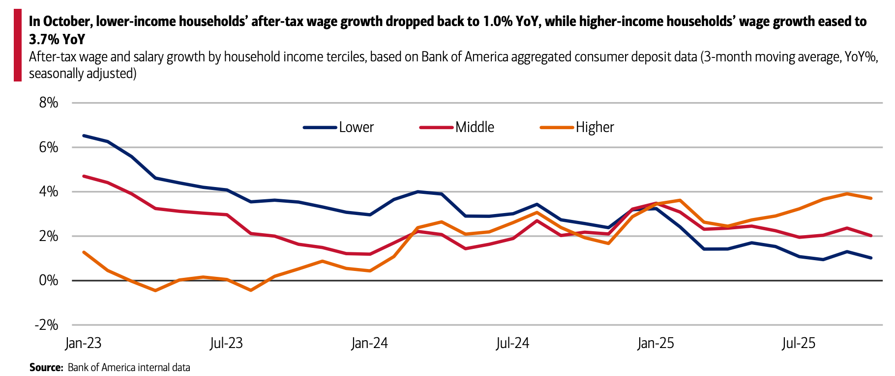 💰 Low-income households are increasingly challenged. From BofA: “In October, wage growth showed signs of softening, according to Bank of America internal data. After-tax earnings for lower-income households rose just 1.0% year-over-year (YoY), compared to 2.0% for middle-income and 3.7% for higher-income groups. As a result, the wage growth gap between higher- and lower-income households remains pronounced. In fact, the 2.7 percentage point (pp) difference in October matches the level seen in August 2025 – the highest since this data series began in 2016.“