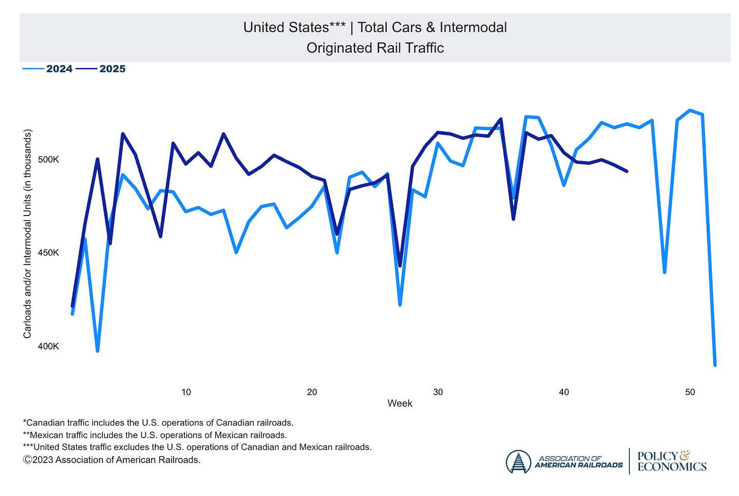 🚂 Freight traffic and volumes are down. Here’s Renaissance Macro’s Neil Dutta on AAR rail traffic data: “Freight activity appears to be cooling. Intermodal railcar loadings are off 8.7% year-over-year for the week ending November 8. Probably not the best sign for industrial activity in Q4.”
