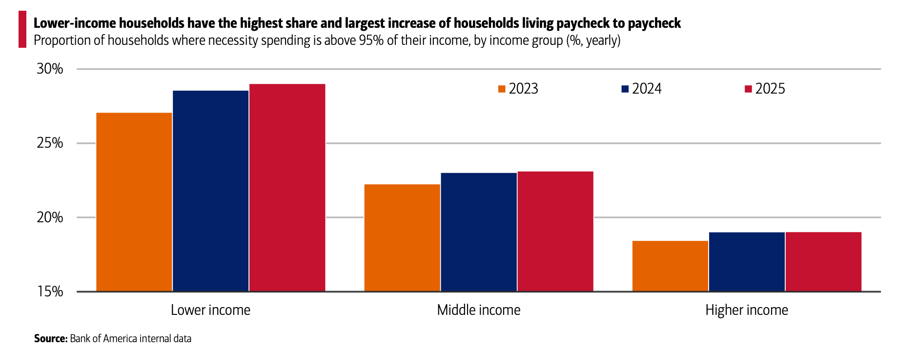 More from BofA: “In 2025, 29% of lower-income households are living paycheck to paycheck – up from both last year and 2023. Meanwhile, the share of middle- and higher-income households living paycheck to paycheck has barely budged.“