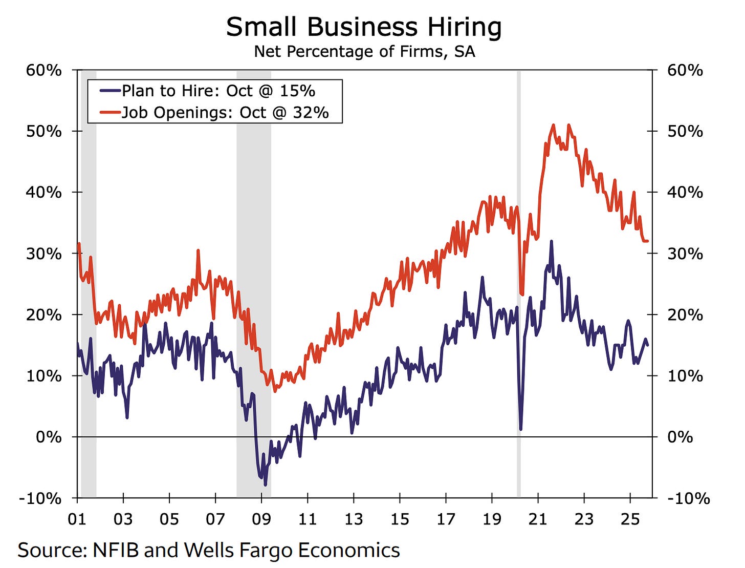 👎 Small business optimism ticks lower. The NFIB’s Small Business Optimism Index declined to 98.2 in October from 98.8 in September. From the NFIB: “Optimism among small businesses declined slightly in October as owners report lower sales and reduced profits. Additionally, many firms are still navigating a labor shortage and want to hire but are having difficulty doing so, with labor quality being the top issue for Main Street.”