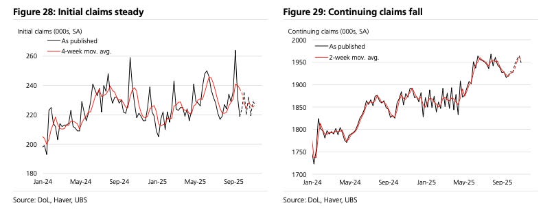 💼 Estimated new unemployment claims hold steady, total continuing claims remain elevated. While the Department of Labor is not publishing unemployment claims reports, economists are estimating national numbers using state-level reports. From UBS: “We estimate initial claims for unemployment insurance were steady in the week ending November 8, down 2K to 227K. The 4-week moving average rose 2K to 227K. Initial claims are currently not historically elevated, but they are not historically low, either. … We estimate that continuing claims for unemployment insurance fell back in the week ending November 1, down 18K to 1945K. Continuing claims mounted in the last two weeks of October and now sit roughly at the level the week ending October 11. Still, continuing claims are up 18K over four weeks, and the 2-week moving average of continuing claims sits 78K above its level last year."