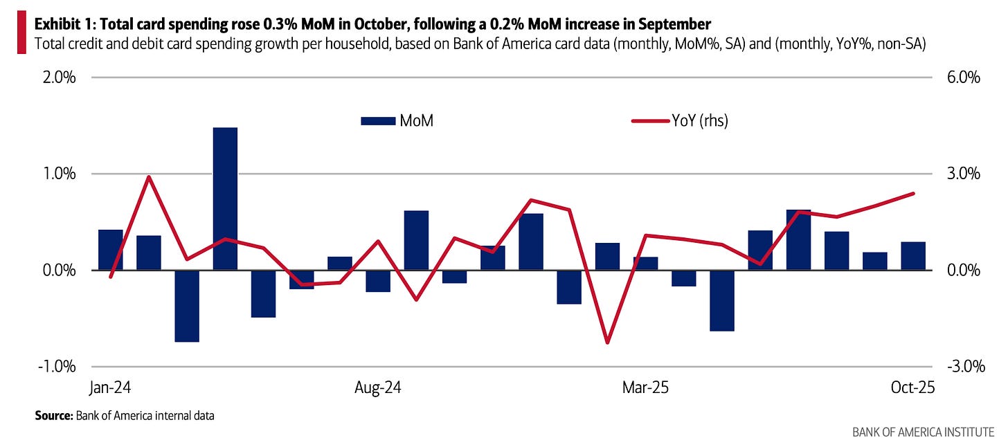 💳 Card spending data is holding up. From BofA: “In October, total credit and debit card spending per household recorded the largest year-over-year (YoY) jump since February 2024, up 2.4% YoY, compared to 2.0% YoY in September, according to Bank of America aggregated card data. Seasonally adjusted (SA) spending growth per household increased 0.3% month-over-month (MoM), continuing a solid run of increases over the past five months.”
