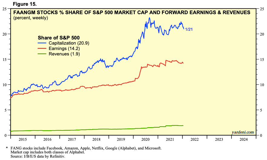 While these so-called FAANGM4 companies account for 1% of the names in the S&P 500, they account for a whopping 14% of the index’s earnings.5