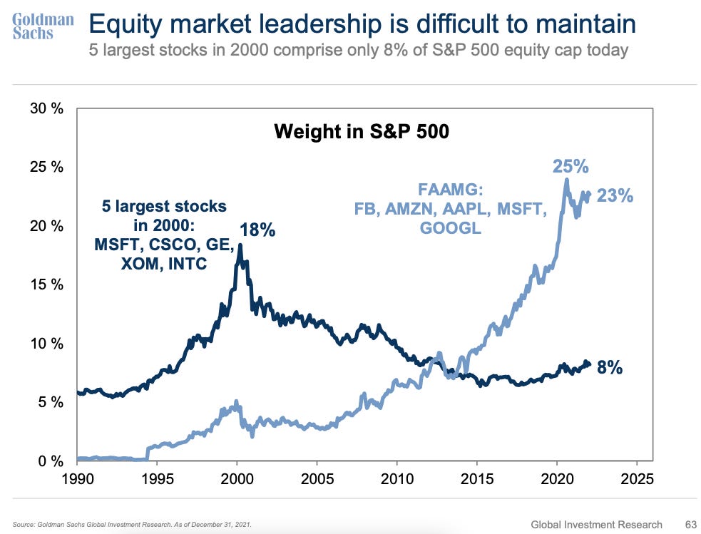If you haven’t, the message is simple: Five stocks (Facebook,1 Apple, Amazon, Microsoft, and Google2) account for about a quarter of the market capitalization of the S&P 500, which consists of 500 companies.